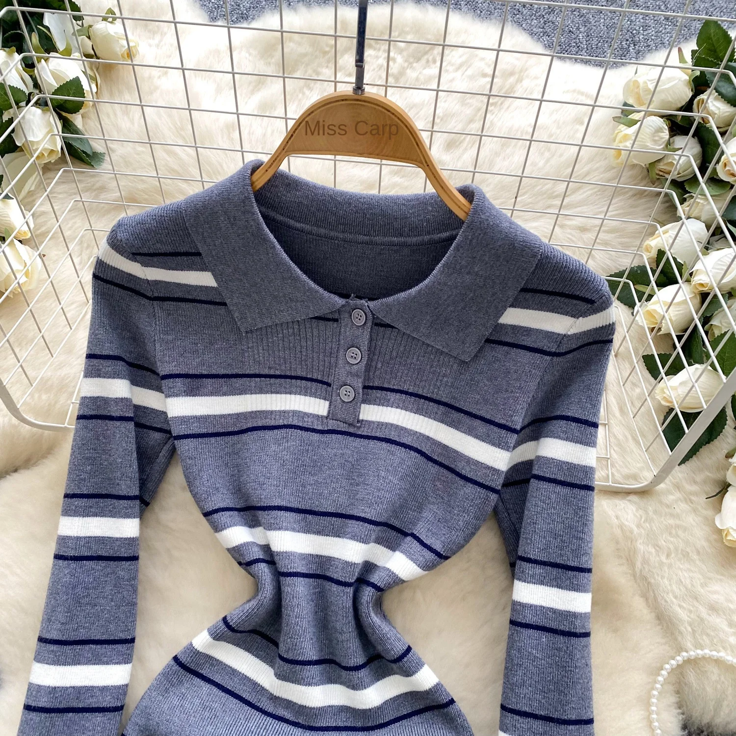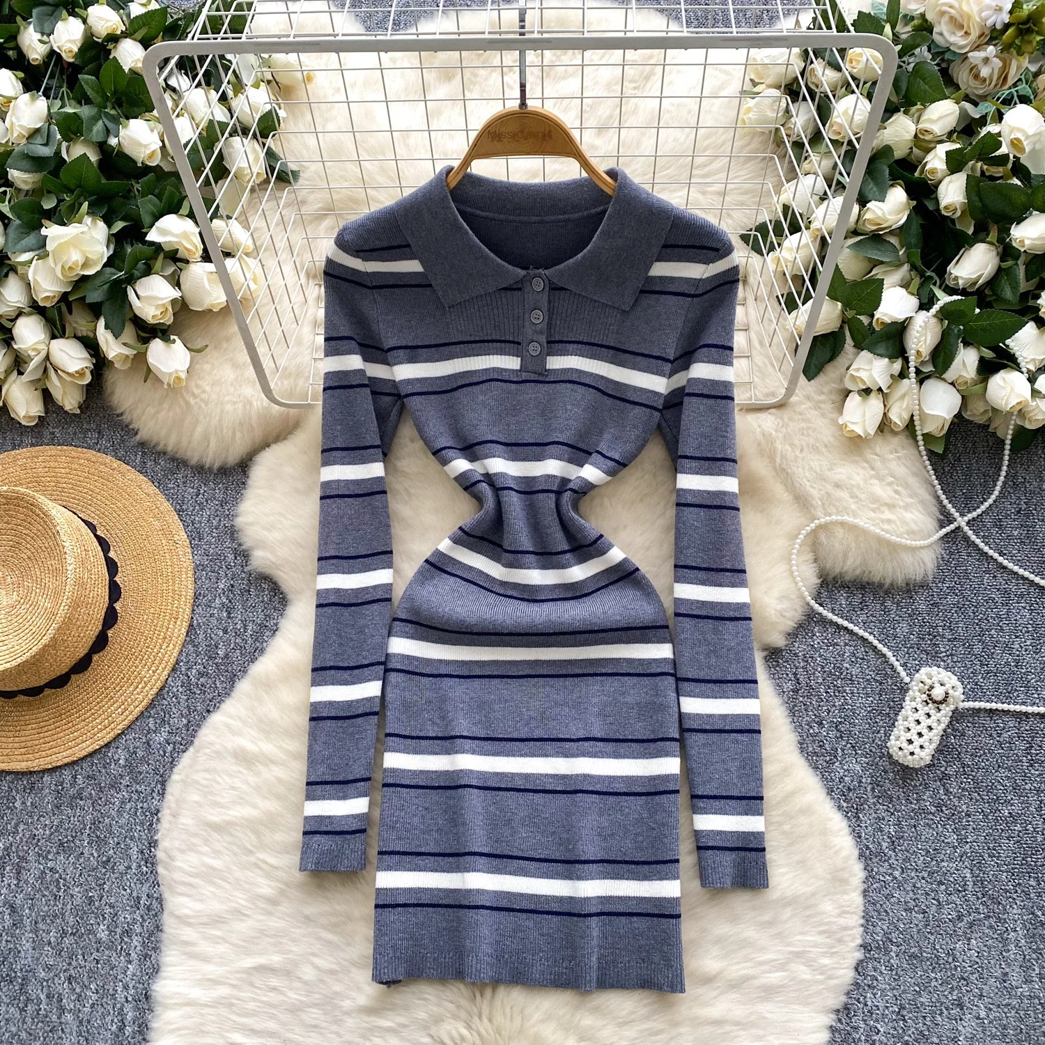 Autumn French Vintage Fashionable Contrast Color Striped High Waist Dress Women's Tight Waist Elegant Lapel Long Sleeve Sweater